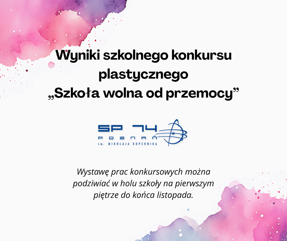 Z radością ogłaszamy wyniki szkolnego konkursu plastycznego „Szkoła bez przemocy”, zorganizowanego przez Szkołę Podstawową nr 74 im. Mikołaja Kopernika w Poznaniu w ramach Tygodnia Przeciwdziałania Przemocy Rówieśniczej.