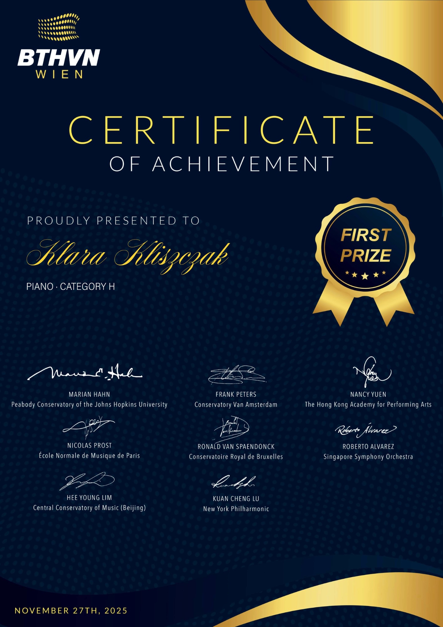 27 listopada 2025 Klary Kliszczak uczennica klasy 7c, zdobyła Pierwszą Nagrodę w finale dwuetapowego międzynarodowego konkursu The International BTHVN Wien Music Competition w Wiedniu. Międzynarodowy Konkurs Muzyczny BTHVN w Wiedniu to wiodący na świecie internetowy konkurs muzyczny, który odbywa się raz w roku, a biorą w nim udział muzycy, z całego świata.