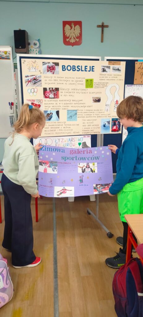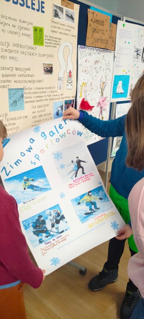 Z radością wspominamy projekt pt. Zimowa galeria sportowców. Uczniowie przygotowali własne plakaty o zimowych dyscyplinach — od bobslejów, przez curling, łyżwiarstwo aż po narciarstwo. Dzieci z dumą prezentowały swoje projekty, opowiadając o ciekawostkach, zasadach i sportowcach, którzy je inspirują. Było dużo radości, kreatywności i sportowego ducha.