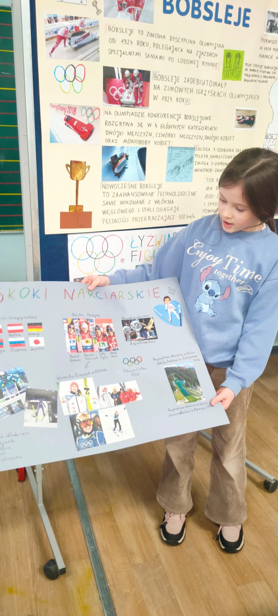 Z radością wspominamy projekt pt. Zimowa galeria sportowców. Uczniowie przygotowali własne plakaty o zimowych dyscyplinach — od bobslejów, przez curling, łyżwiarstwo aż po narciarstwo. Dzieci z dumą prezentowały swoje projekty, opowiadając o ciekawostkach, zasadach i sportowcach, którzy je inspirują. Było dużo radości, kreatywności i sportowego ducha.
